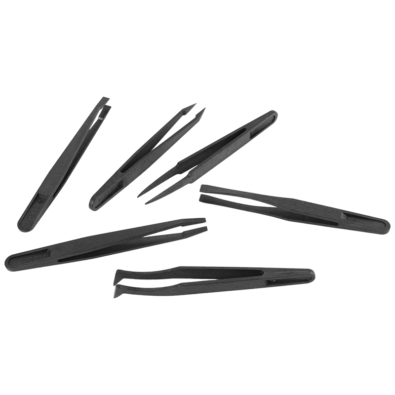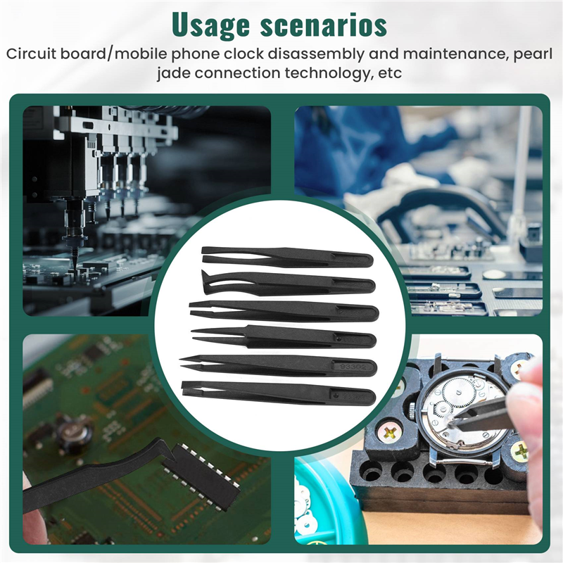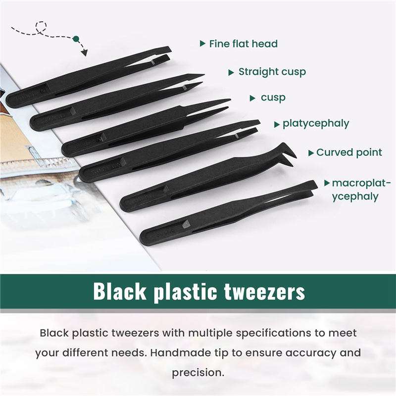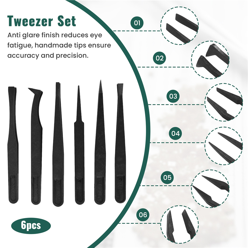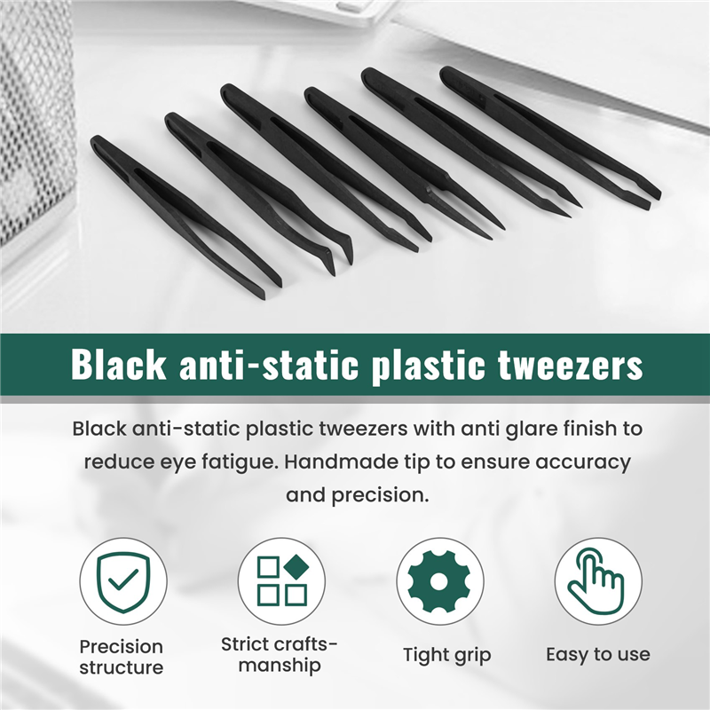 6PCS Precision Tweezer Set Plastic Anti Static Tool Kit Size 1/2/3/5/6/8 each one(Black)Anti-glare to reduce eye strainHand finished tips for precision and accuracySafe for use with electronic components