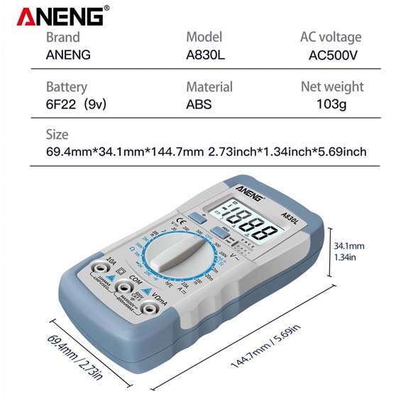 - AC Voltage (ACV): Measurement ranges of 200V, 600V with ±1.0% accuracy