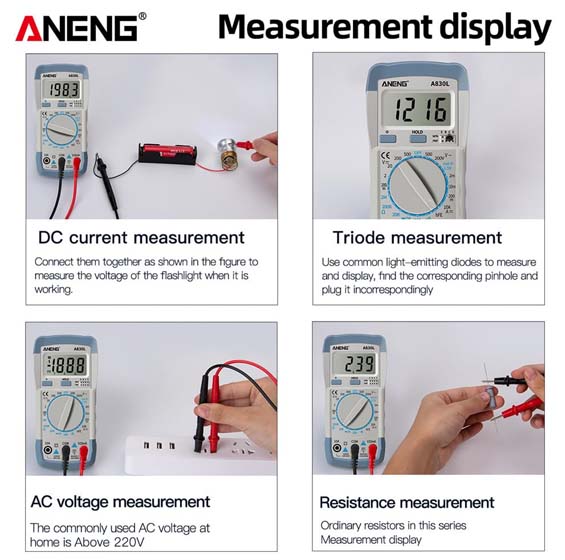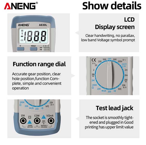 - DC Voltage (DCV): Measurement ranges of 200mV, 2V, 20V, 200V, 600V with ±0.5% accuracy