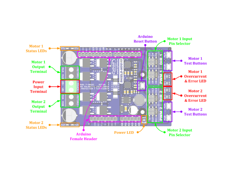 The Cytron 10A Dual Channel DC Motor Driver Shield for Arduino Uno is a 2-channel high power motor driver shield. It is able to control two brushed DC motors or single bipolar/unipolar stepper motor from 7 V to 30 V. This Dual Channel DC Motor Driver Shield is capable of supporting 10A per channel.
