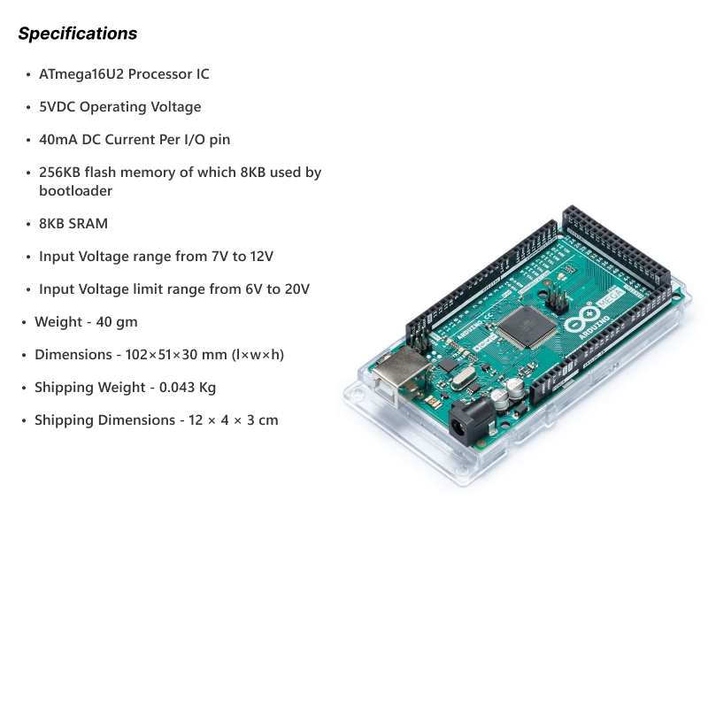 This is an Original Arduino Mega board from Arduino Officials based on ATmega16U2. The Official Arduino Mega 2560 is a Rev3 development board based on the ATmega2560 microcontroller. The board has 54 digital input/output pins (of which 14 can be used as PWM outputs), 16 analog inputs, 4 UARTs (hardware serial ports), a 16MHz crystal oscillator, a USB connection, a power jack, an ICSP header, and a reset button. It contains everything needed to support the microcontroller, simply connect it to a computer with a USB cable or power it with an AC to DC adaptor or battery to get started.