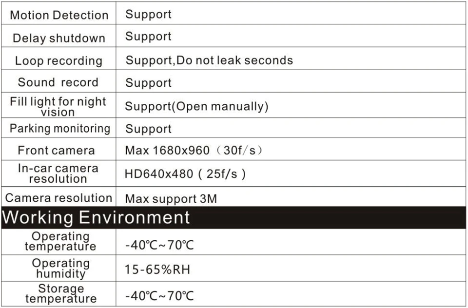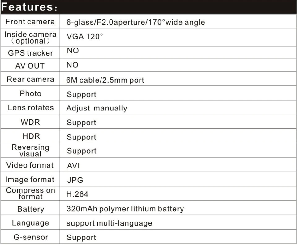 - • Includes G-Sensor, Cycle Recording, Motion Detection, and Parking Monitor.